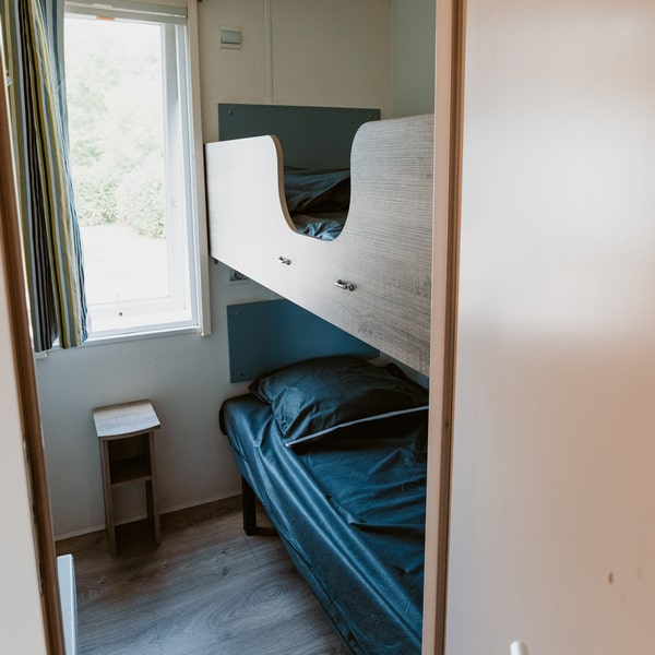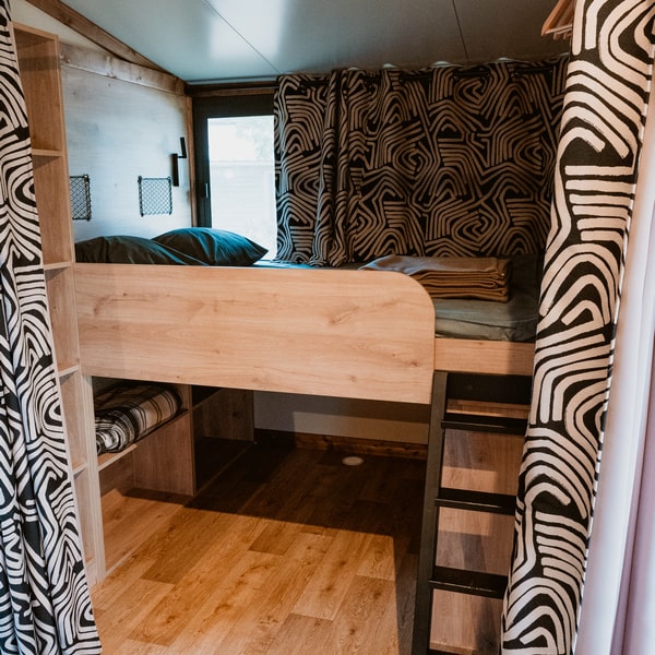 Une chambre avec un lit double (140×200) séparée du séjour par un rideau occultant, une seconde chambre sous le auvent composée d’un lit superposé avec un lit double (140×190) en dessous et un lit simple (90×190) au-dessus. La location ne comprend pas le linge de lit et de toilette (disponible en supplément).