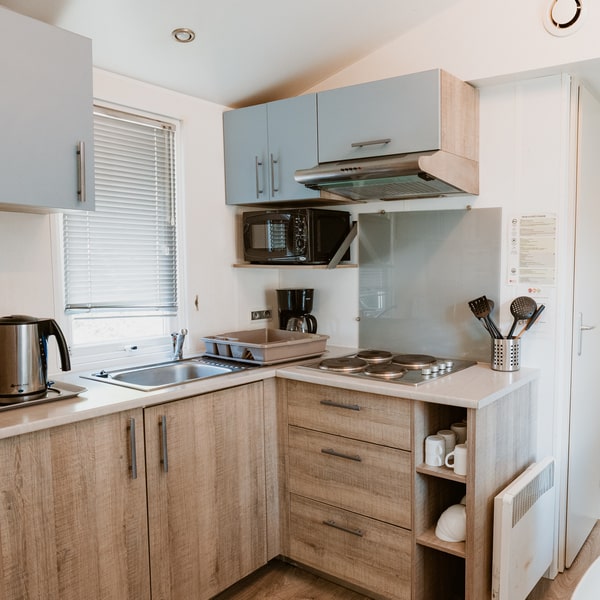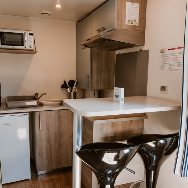 Pas de cuisine, utilisation de la cuisine et de l’espace « Accueil Vélo » du camping.